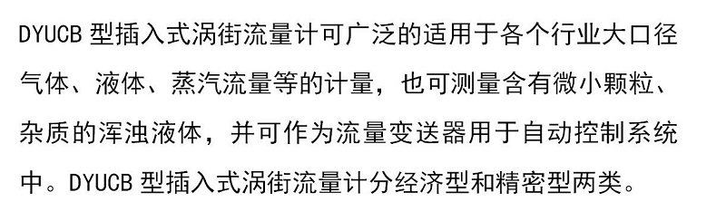 DYUCB型插入式渦街流量計可廣泛的適用于各個行業(yè)大口徑氣體、液體、蒸汽流量等的計量,也可測量含有微小顆粒、雜質(zhì)的渾濁液體,分經(jīng)濟(jì)型和精密型兩類。